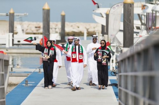 Family and friends walking towards the dock carrying UAE flags celebrating National Day|